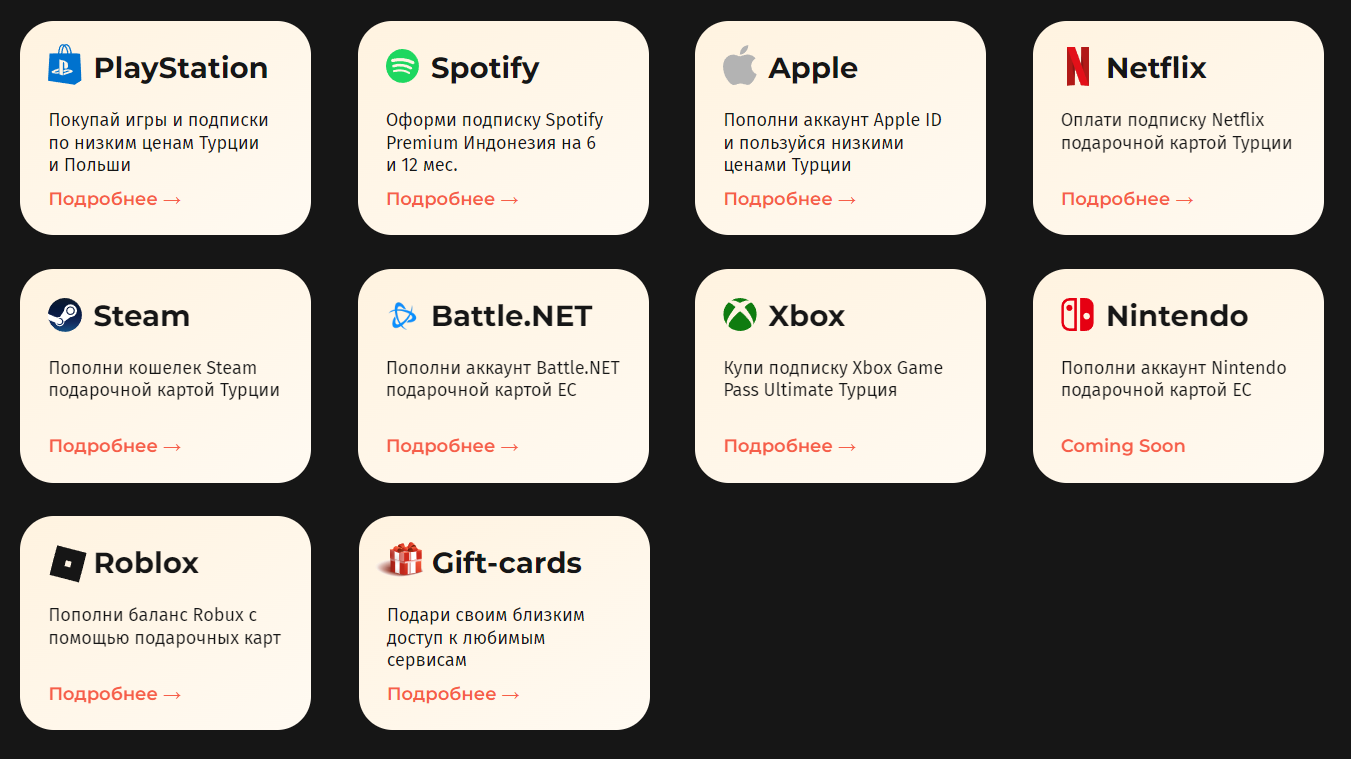 - podpiska.org (PlayStation, Spotify, Apple, Netflix, Steam, xBox и др.);