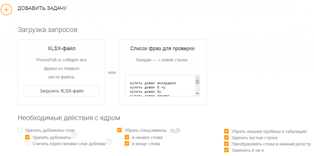 Также рекомендуем почистить ядро перед кластеризацией от спецсимволов: +?-. Для этого есть бесплатный нормализатор слов. Помимо очистки спецсимволов инструмент убирает дубли, лишние пробелы и табуляцию, пустые строки, преобразует слова в нижний регистр и изменяет «ё» на «е».