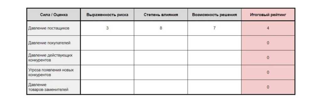 Чтобы провести экспресс-анализ пяти конкурентных сил Портера, нарисуйте таблицу из пяти столбцов.