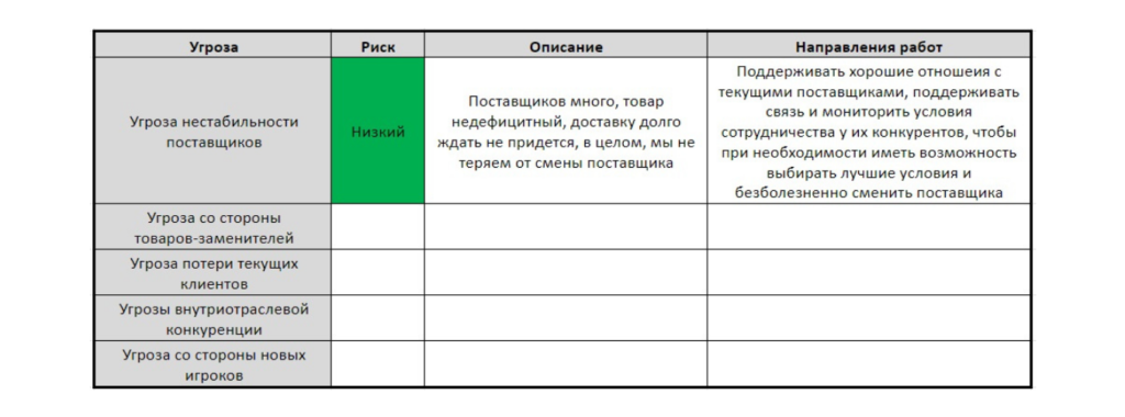 Аналогичным образом оценивают оставшиеся четыре силы. После этого результаты заносят в таблицу. Записывают название угрозы, степень риска, описание (с чем связана такая степень риска) и направление работ (что делать, чтобы исправить ситуацию). Последний столбец — самый важный, ради него всё и затевалось.