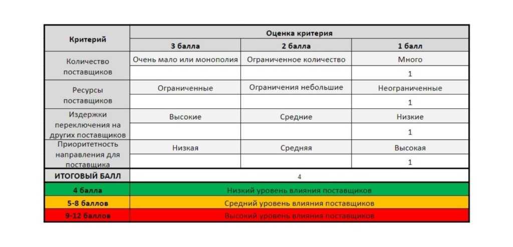 Для полного анализа 5 сил Портера надо каждую силу разложить на критерии и рассмотреть в отдельной таблице. Каждый критерий оценивается по трехбалльной шкале: слабая степень выраженности (1 балл), средняя (2 балла), сильная (3 балла). Затем баллы по всем критериям складываются. Так определяется уровень риска по каждой силе: низкий, средний, высокий.