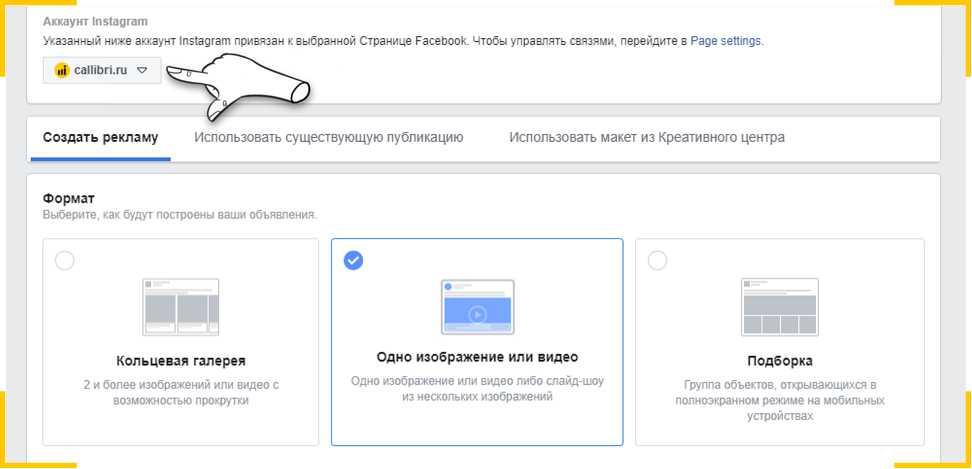 Итак, мы добрались до самого объявления. Вы можете выбрать пост, который уже размещен в вашей ленте (в разделе «Использовать существующую публикацию») или создать новое объявление. Проверьте, что выбран верный Instagram-аккаунт. ![]()