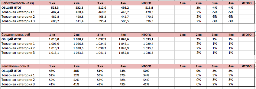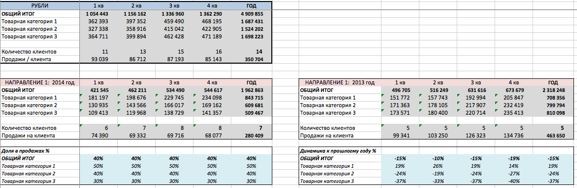Анализ выполнения плана продаж мы проводим по трем показателям: отгрузки в натуральном выражении, выручка и прибыль. В каждой таблице мы рассчитываем % выполнения плана и динамику по отношению к прошлому году. Все планы разбиты по товарным категориям, что позволяет более детально понимать источники недопродаж и перевыполнения плана. Анализ проводится на ежемесячной и ежеквартальной основе.