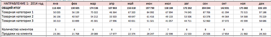 Далее мы собираем статистику отгрузок по основным направлениям отдела сбыта. Общую выручку (в рублях) мы разбиваем по направлениям сбыта и по основным товарным категориям. Статистика необходима только в рублевом значении, так как помогает контролировать общую ситуацию в продажах. Более детальный анализ необходим только в том случае, если в одном из направлений отмечается резкое изменение динамики продаж.