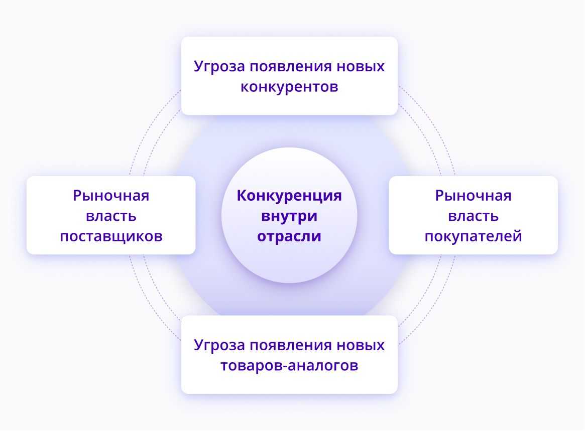 Модель пяти сил Портера определяет силу конкурентов, угрозы, находит конкурентные преимущества и подсказывает, как выбрать нишу и позиционировать продукт правильно.