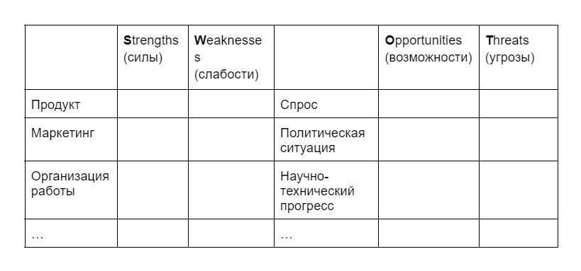 Как обычно выбирают сильные и слабые стороны: продукт компании, финансы, организацию работы персонала, маркетинг, состояние производства, гибкость компании, которая отвечает за способность адаптироваться к изменениям. Для возможностей и угроз учитывают научно-технический прогресс, уровень конкуренции, спрос на продукт, экономическую ситуации. Каждый пункт описывается и оценивается по десятибалльной шкале.