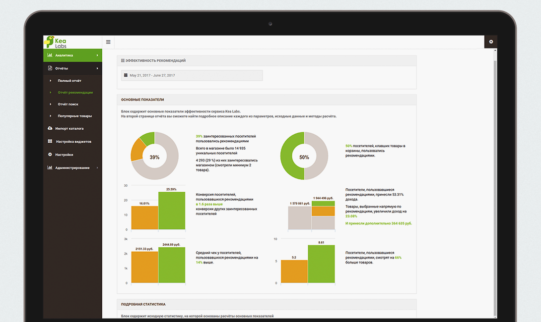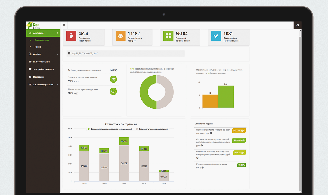 Используя Kea Labs, ты сможешь увеличить конверсию и средний чек. Рекомендации увеличивают конверсию в два раза, а доход в среднем возрастает на 15 процентов. Кроме того, показ релевантных товаров может основываться на поведении покупателя или на истории покупок других клиентов и выдавать персональные рекомендации. А если покупатель не знает, что нужно подобрать к его покупке, то ему будут показаны сопутствующие товары, которые выбирают другие люди.