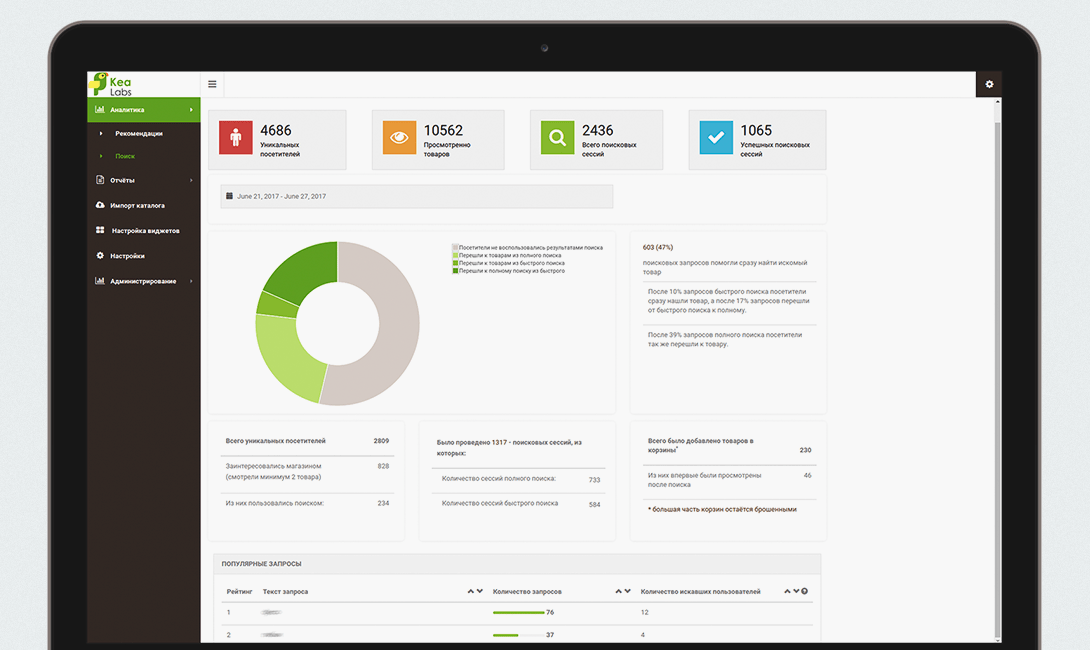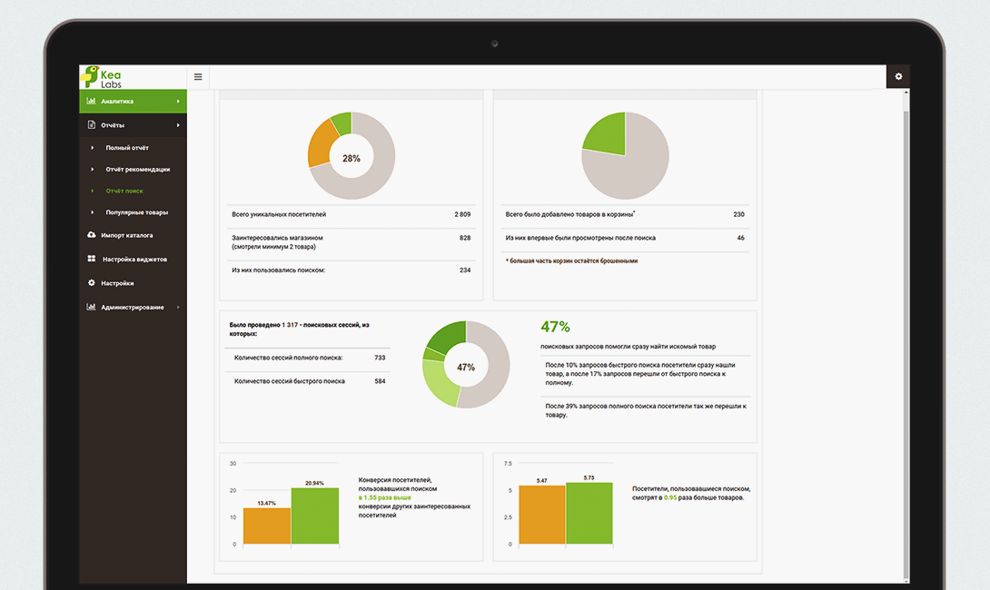 Умный поиск — это полная замена поиска в магазине, которая направлена на повышение продаж, на что же еще? Даже если покупатель введет в поиске «шЗрщту» или опечатается, то алгоритм автоматически распознает эту чушь и выдаст то, что он хотел написать (iPhone, как пример), но забыл переключить клавиатуру. Кроме того, предмет покупки можно будет найти по категориям, цвету и даже профильтровать по параметрам товара. Поиск от Kea Labs работает быстрее стандартного, а также предоставляет полную аналитику: ты можешь анализировать спрос и даже понимать, что ищут покупатели, но не находят в твоем магазине.