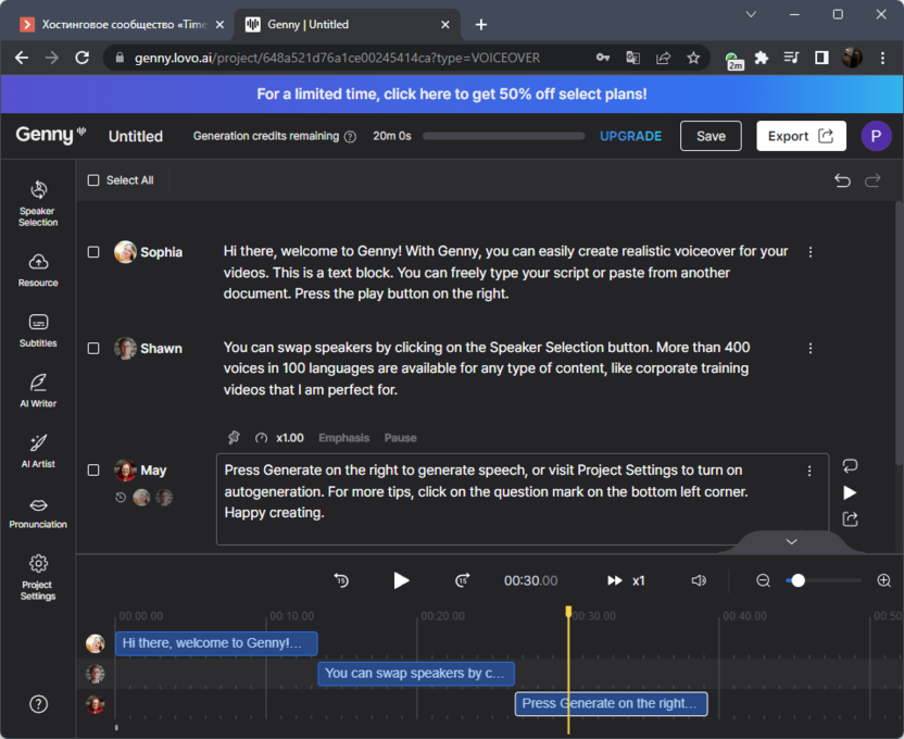 Разных сайтов для озвучки текста существует еще большое количество, но многие из них базируются на уже знакомых многим языковых моделях, которые не самые качественные. Останавливаться на таких я не буду, поэтому в завершение расскажу про еще однин интересный сайт – Genny. Однако учитывайте, что пока он имеет довольно ограниченный набор русских голосов (всего три самых известных), но, судя по разделу с поиском, в будущем их добавление планируется. Genny имеет очень удобный редактор с таймлайном, что позволяет добавлять почти неограниченное количество реплик, сказанных разными голосами одновременно или последовательно.