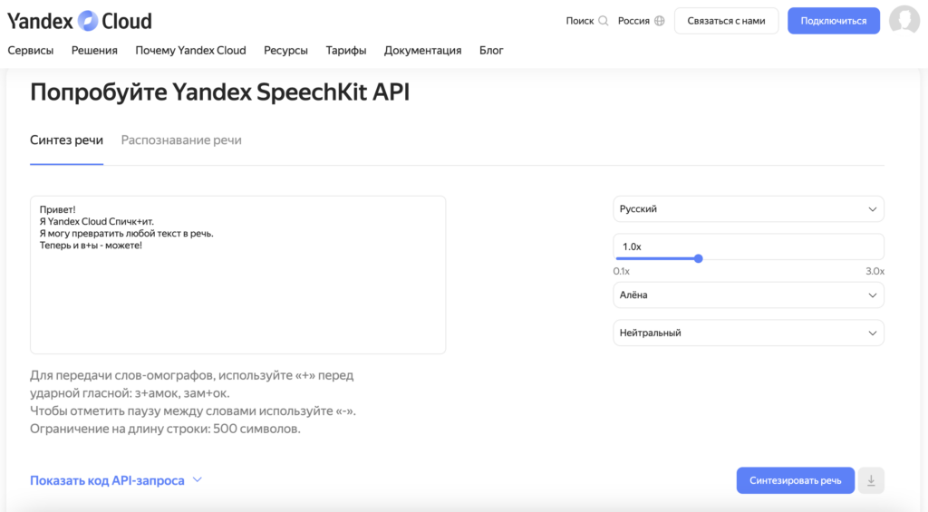 Еще один облачный сервис «Яндекса» умеет как синтезировать, так и распознавать речь. Платформа заточена под работу на русском языке, поэтому автоматическая расстановка интонаций работает хорошо, хотя настроек меньше, чем у аналогичных сервисов.