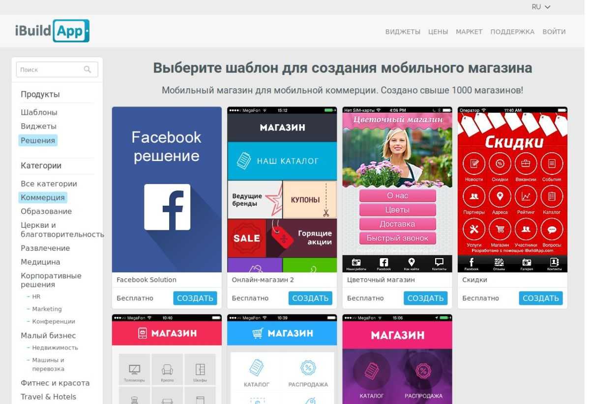 Крупный зарубежный сервис, доступный на русском языке. Он работает по принципу конструктора на базе шаблонов. На сайте предлагается большая библиотека уже готовых приложений для разных отраслей: образование, развлечения, коммерция, благотворительность и так далее, причем есть шаблоны на русском. Вам нужно всего лишь выбрать наиболее подходящий шаблон и отредактировать его по своему усмотрению.