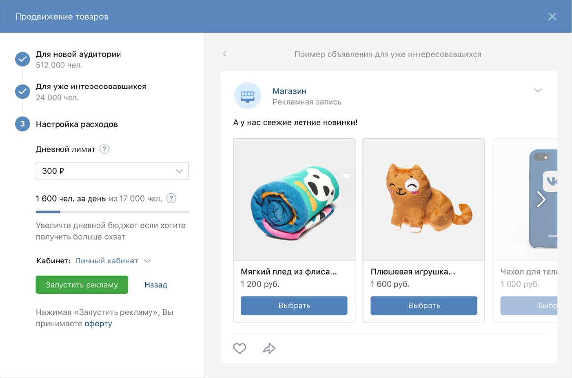 Вы не создаете рекламные креативы и не выбираете цели в настройках своего рекламного аккаунта. Интеллектуальный алгоритм ВКонтакте подбирает нужные товары и показывает их заинтересованным людям и тем, кто уже просматривал каталог, но остался без покупки.
