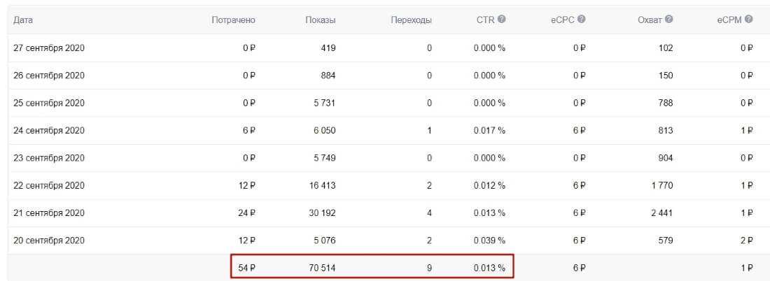 Мы видим, что 26 сентября была рекордная стоимость клика — 100 рублей. (лимит не позволял тратить больше). Почему это произошло? В этот день деньги на РК закончились, он какое-то время лежал без дела, и я снова пополнил баланс для продолжения спин-оффа. А вот при обучении автоматического алгоритма айс не выглядел: кликрейт резко упал, а стоимость клика взлетела до небес.