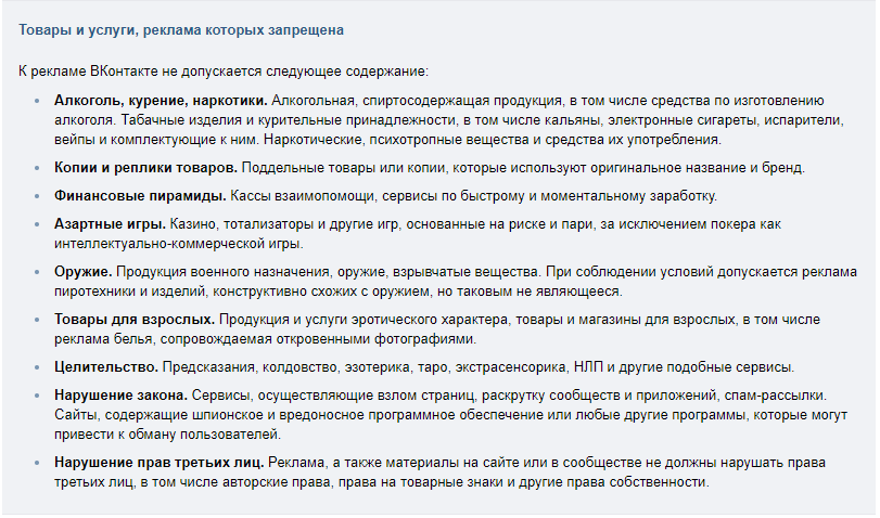 Есть товары и услуги, для которых категорически нельзя использовать рекламу в музыке во ВКонтакте. Так, правилами рекламной сети запрещено продвигать табак и курительные смеси, рецептурные лекарства, финансовые пирамиды, эротику, товары для секса и многое другое. Полный список есть в правилах ВКонтакте.