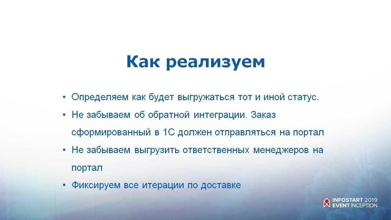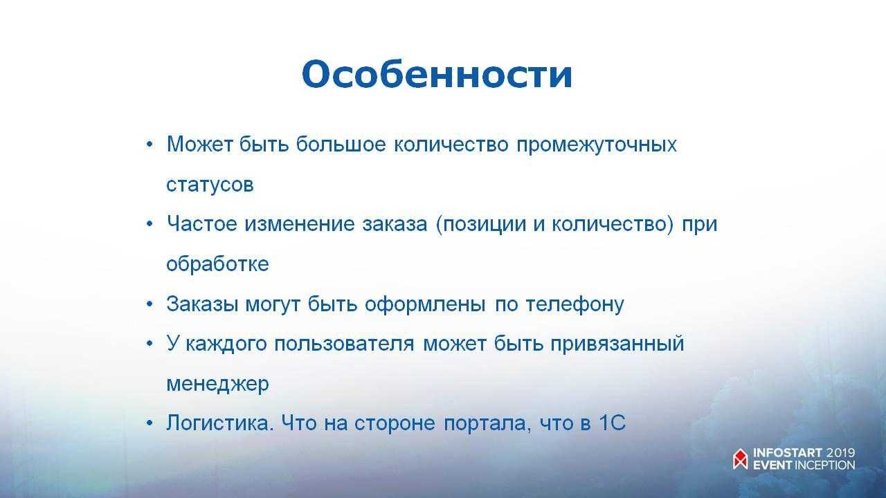 Первое – это статусы. Как заказ будет выгружаться, как он будет меняться. Вообще не стоит делать большое количество статусов. Даже если вам хочется фиксировать каждый шаг по заказу с помощью изменения статуса – не нужно стремиться к этому. Но в то же время мало иметь всего три статуса – заказ принят, в обработке и завершен. Наша рекомендация в этом плане всегда – разделяйте статус логистики и статус заказа в целом. Обычно в B2B-порталах доставка и оплата могут обрабатываться абсолютно по-разному – для каких-то контрагентов обязательна предоплата, кто-то платит по постоплате и пр. Логистический статус нужно передавать как отдельное свойство, чтобы на основе этого свойства менялся нужный статус.