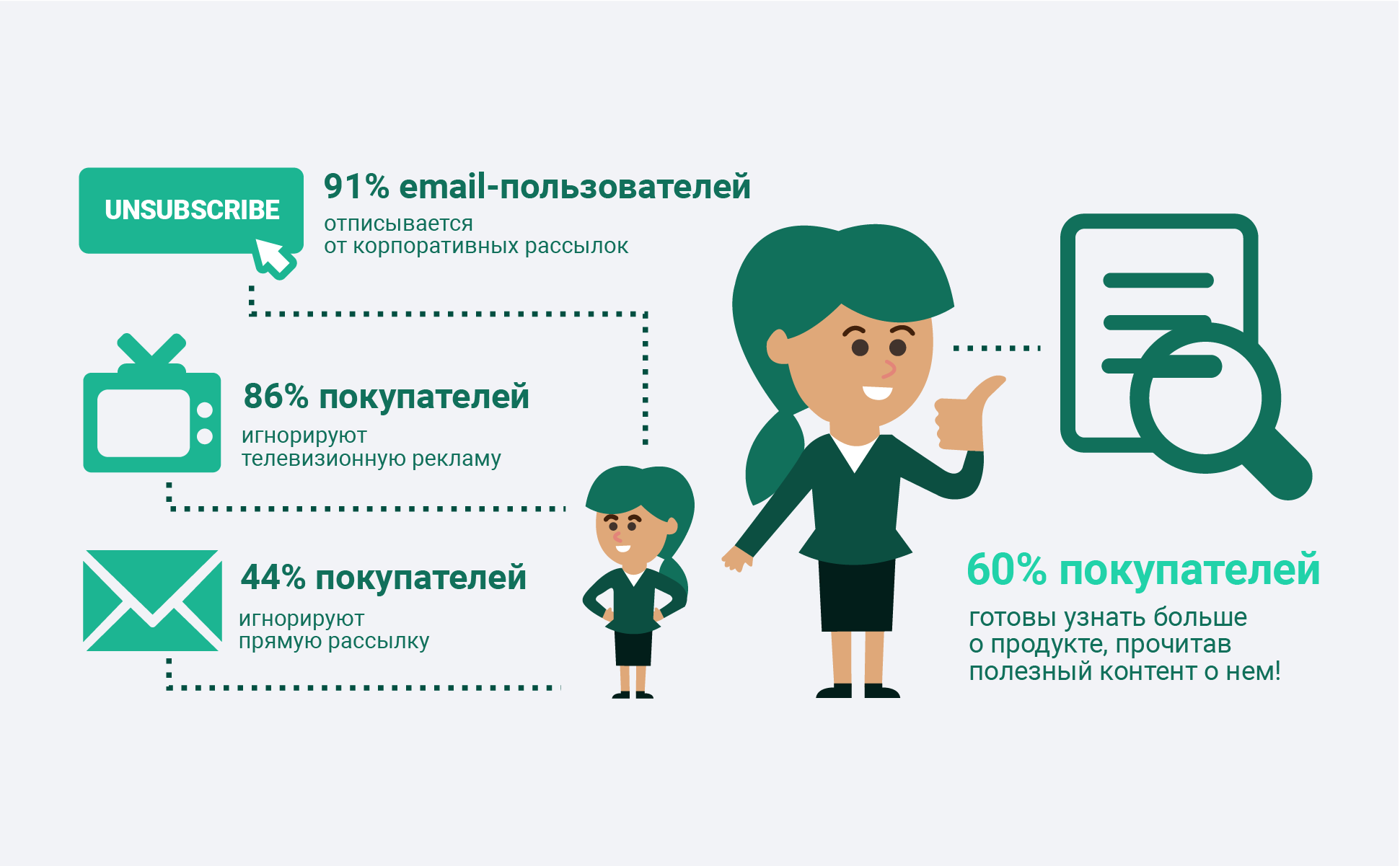 Читать и понимать все письма, которые попадают в ящик, становится сложно, а пользователей все больше раздражают монотонные письма с безличным призывом что-то купить. Поэтому запускать этот вид рекламы самостоятельно не стоит.