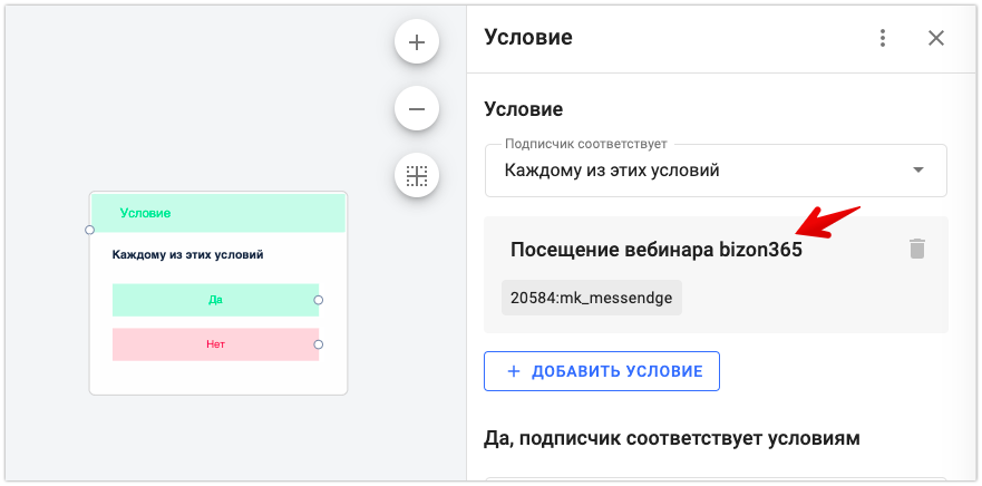 1. Добавьте блок с условием «Посещение вебинара bizon365»