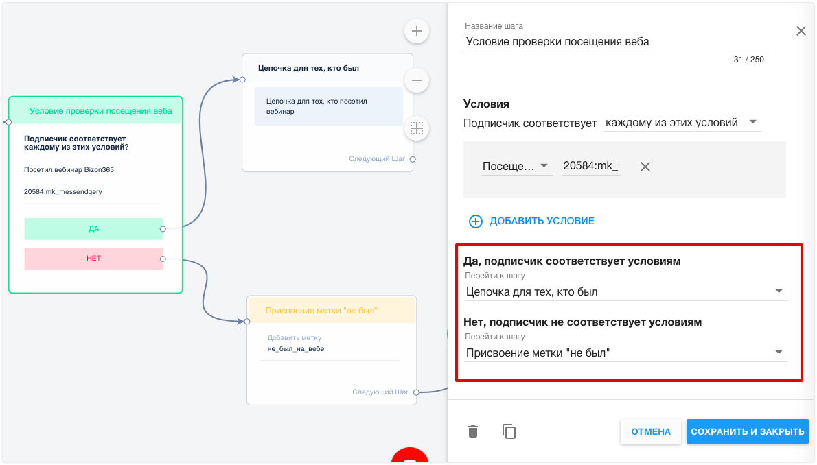 4. Настройте следующие шаги для «Да» — посетил вебинар, «Нет» — не посетил.