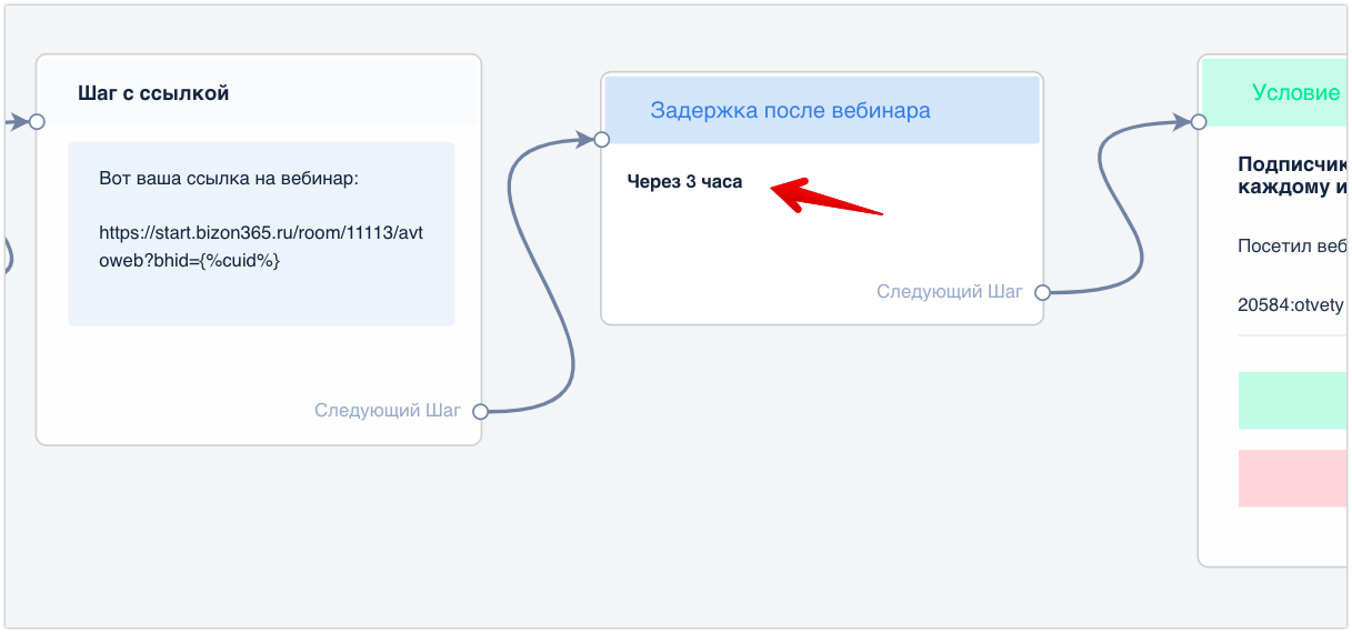 До этого шага вы можете настроить любые другие, например добавить шаги с прогревающим контентом. Также при помощи задержки вы можете настроить отправку шага со ссылкой только в определенные дни и время. Это не влияет на настройку интеграции. Главное правильно прописать саму ссылку и передать cuid пользователя.