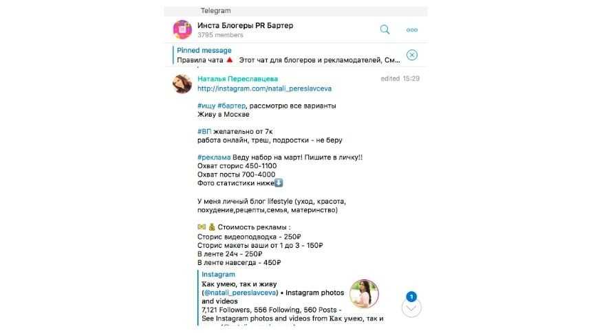 В Telegram много каналов, где публикуются отзывы о размещениях у блогеров или прямые предложения рекламы от блогеров