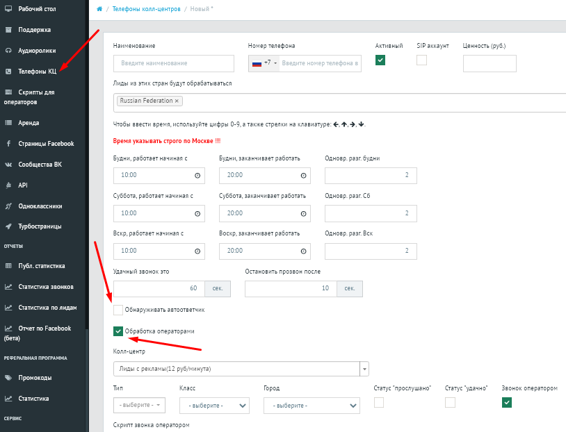 Укажите номер телефона и режим работы отдела продаж вашего заказчика (ВНИМАНИЕ: указывайте по московскому времени).Не забудьте уточнить сколько одновременных звонков может принимать ваш заказчик, в выходные этот лимит может отличаться. Также вы можно задать длительность звонка, которое будет считаться Успешным звонком