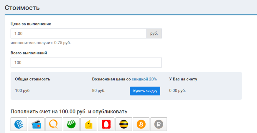 В конце страницы вам будет отражена итоговая стоимость, в которую «обойдется» выполнение вашей задачи. Для запуска задачи в ротацию необходимо лишь пополнить аккаунт любым удобным вам способом.