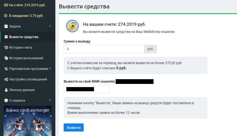 Как только появится необходимость вывести заработанное, перейдите на страницу «Вывести средства», введите нужную сумму и нажмите на кнопку «Вывести».