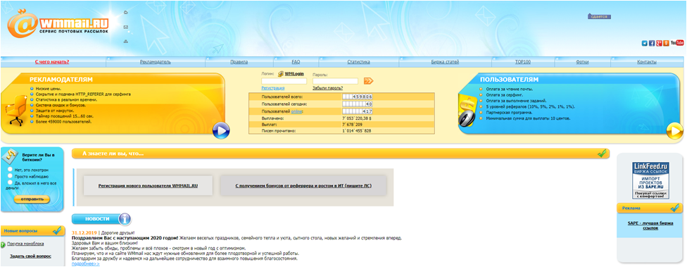 Это один из топовых почтовиков, предлагающий огромный объем элементарной работы, с которой справится любой желающий Вы в качестве обычного пользователя (исполнителя) помогаете рекламодателями своими действиями и получаете за это заслуженную оплату. Открылся WMRFast уже довольно давно, летом 2014 года. За 5 лет существования проект добился довольно высоких показателей – на нем зарегистрировано более 1.2 млн. участников, а общая сумма выплат достигает 24 млн. рублей. Это говорит о том, что на проекте действительно можно зарабатывать и выводить средства. основные преимущества и особенности WMRFast: регистрация на проекте является абсолютно бесплатной и открытой для всех желающих; заработок на WMRFast осуществляется с помощью 8-ми простых способов, подробнее о каждом из них я расскажу ниже; работать на сайте можно в любое удобное для себя время и в любом месте; с недавних пор появилась мобильная версия сайта WMRFast, поэтому можно заниматься делами даже со смартфона или планшета; вывод денег с WMRFast осуществляется на электронные кошельки и баланс телефона в автоматическом режиме; при активной работе на ВМРФаст вы сможете подниматься по карьерной лестнице и увеличивать свой заработок; имеется партнерская программа, которая состоит из 3-х уровней; администрация сайта регулярно проводит конкурсы, предоставляет бонусы и акции. ограничений на минимальный вывод нету