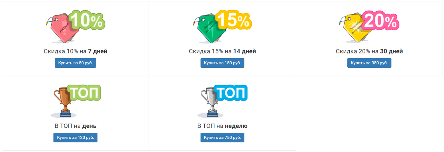 - Есть разные бонусы, которые вы можете приобретать. Во-первых, это скидка. Так, если вы потратите 50 рублей, сможете неделю создавать задания на 10 процентов дешевле. За 350 же рублей скинете 20 процентов стоимости на месяц. Также можно купить ТОП и находиться в верхней части списка заданий, которые показываются пользователям: за 120 рублей на день, и за 750 – на неделю.