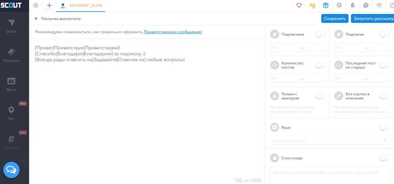Через сервис можно запускать рассылку по подписчикам, выставив фильтр по количеству постов, наличию аватарки и ссылок, языку, установив стоп-слова и другие фильтры. Само письмо также поддерживает вариативность.