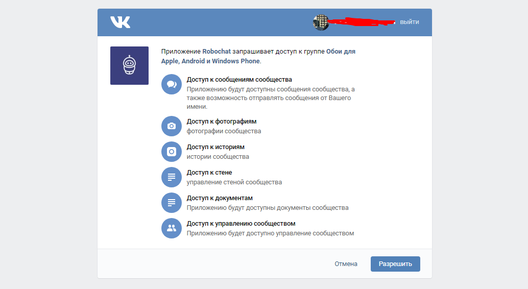 Сервис попросит вас дать доступ к управлению сообществом. Нажмите кнопку «Разрешить».