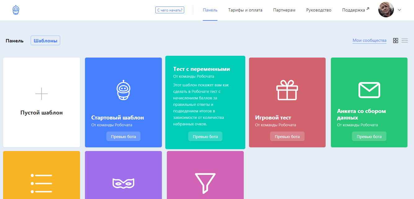 Как и в BotHelp, сделать чат-бот можно в онлайн-редакторе или через партнёров. В первом случае вы собираете сценарий из блоков на базе шаблона: доступно около 30 готовых алгоритмов. Во втором — заказываете разработку решения у специалистов.
