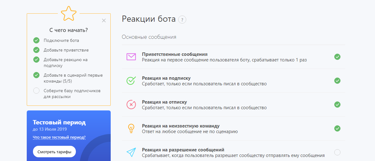 Оставим включенной кнопку «Начать» — так пользователю проще начать взаимодействовать с ботом