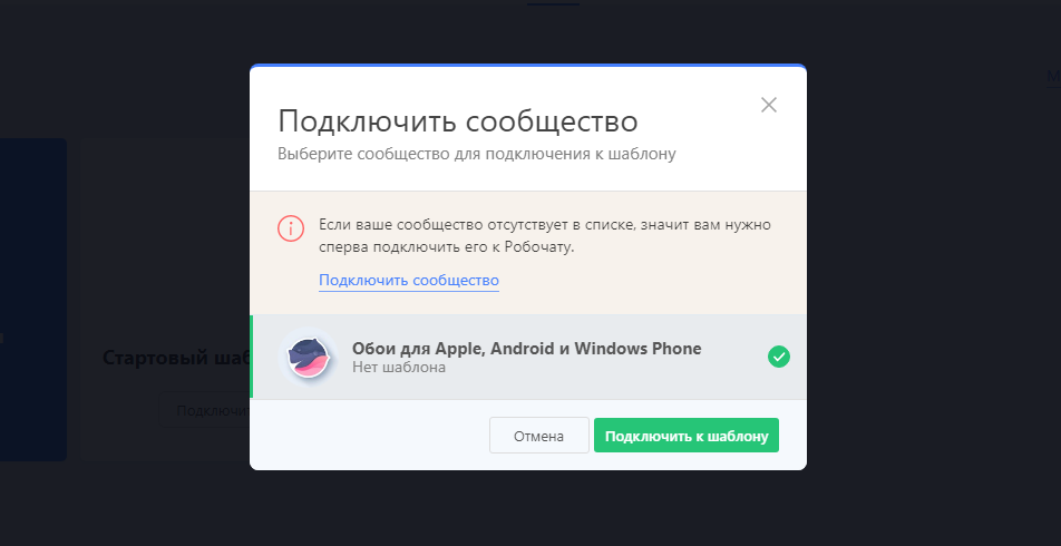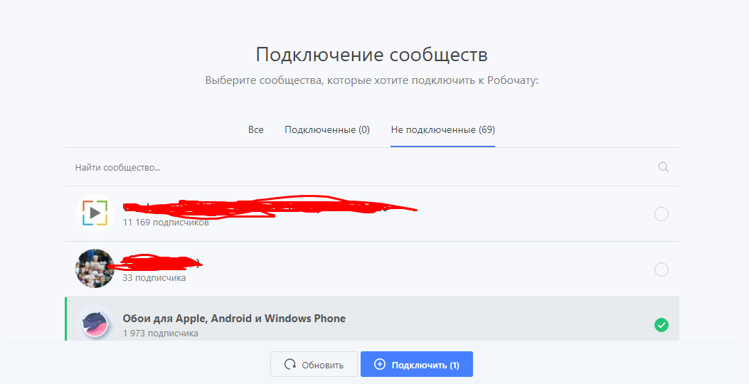 Сервис отобразит список сообществ, в которых у вас есть права администратора. Выберите аудиторию в списке и нажмите кнопку «Подключиться».