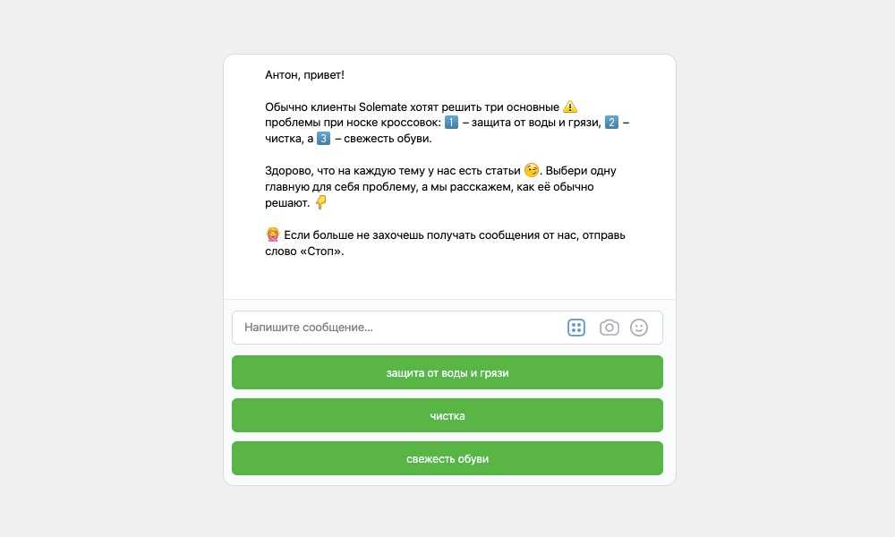 Подробнее о чат-боте. После клика по рекламному объявлению пользователь попадает на внутренний лендинг ВКонтакте, где бренд предлагает чек-лист по чистке кроссовок в личные сообщения. После того, как юзер нажал на кнопку «Получить» на лендинге, он автоматически становится подписчиком рассылки, и ему приходит стартовое сообщение от чат-бота. В нем мы предлагаем выбрать средство, которым человек обычно чистит кроссовки. Вот как это выглядит:
