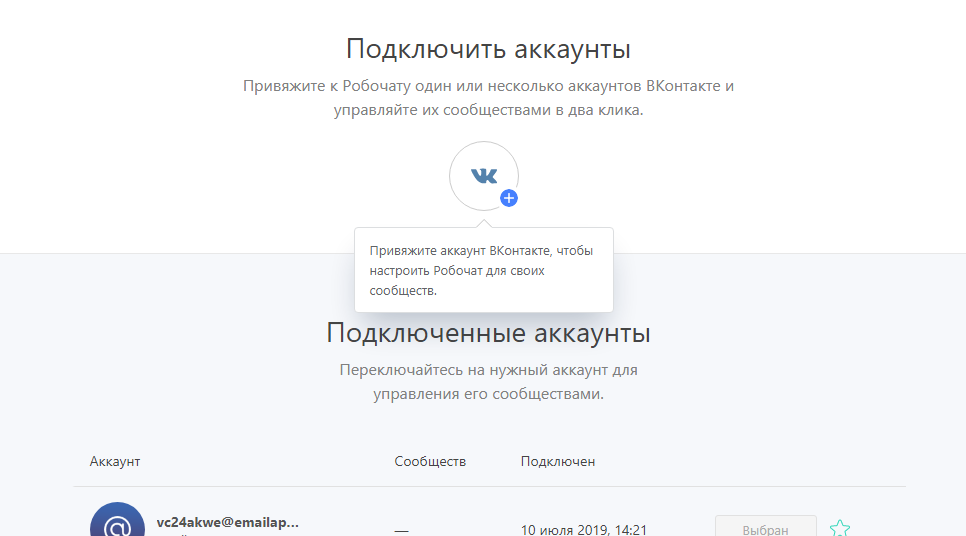 После авторизации подключите сообщество, для которого хотите создать чат-бота. Нажмите кнопку «Подключить бота».