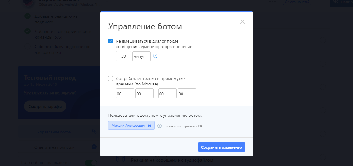 Приложение запросит доступ к сообществу, после чего откроется окно, в котором можно настроить бота.