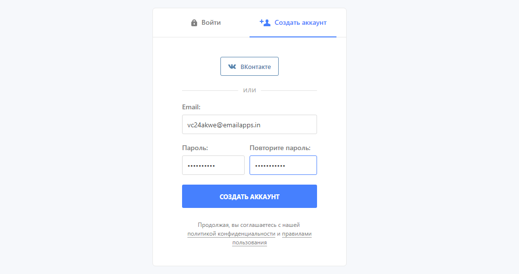 Чтобы создать чат-бота на Robochat.io, перейдите на сайт сервиса и авторизуйтесь. Используйте данные своего профиля ВКонтакте или пройдите стандартную регистрацию с адресом электронной почты.