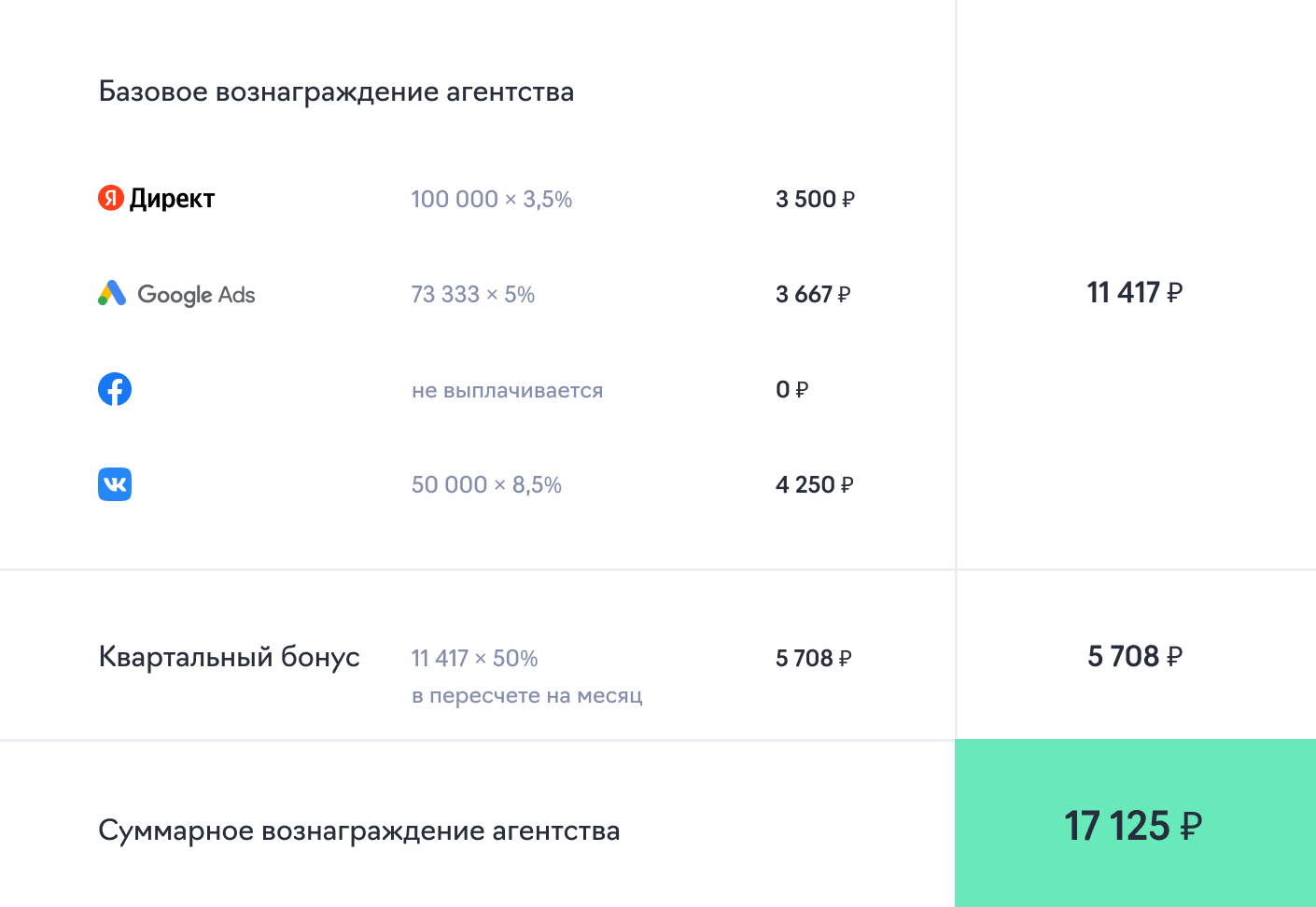 Рассчитаем, какое вознаграждение и квартальную премию получит наше агентство в Click.ru. Траты по Google Ads у агентства составляют более ⅓ оборота по другим системам, поэтому вознаграждение будет рассчитываться от ⅓ суммарного оборота по Директу, Facebook и «ВКонтакте», то есть на 220 000 × ⅓ = 73 333 рублей.