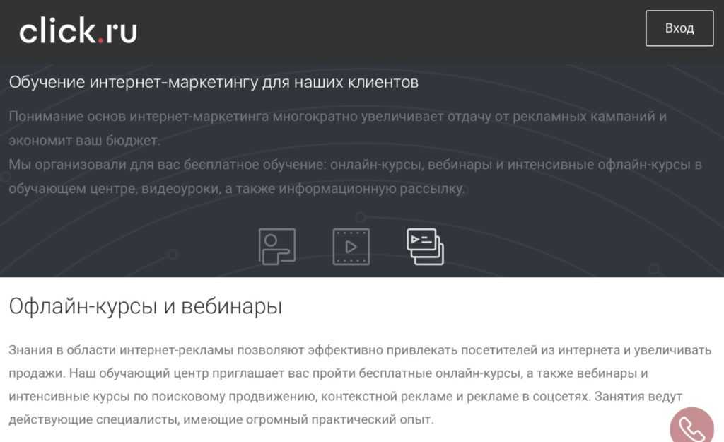 Click.ru — официальный партнер обучающего центра, его специалисты регулярно проводят здесь платные и бесплатные обучающие мероприятия. Если таких форматов вам мало, то добро пожаловать в блог компании – blog.click.ru.