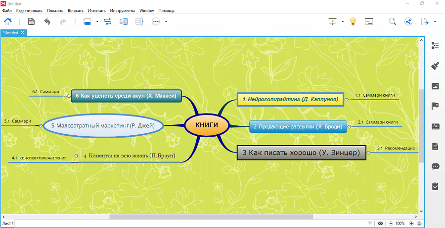 | MindMeister | Интернет, мобильный | Встраивание презентаций, управление проектами, встроенная библиотека визуального контента | Делитесь, заметки, комментарии, чат | Экспорт в Word, PowerPoint, PDF и другие форматы. Импорт из Freemind, XMind и др. | Три карты, режим презентации, доступ к библиотеке иконок и изображений | От $4,99 в месяц |