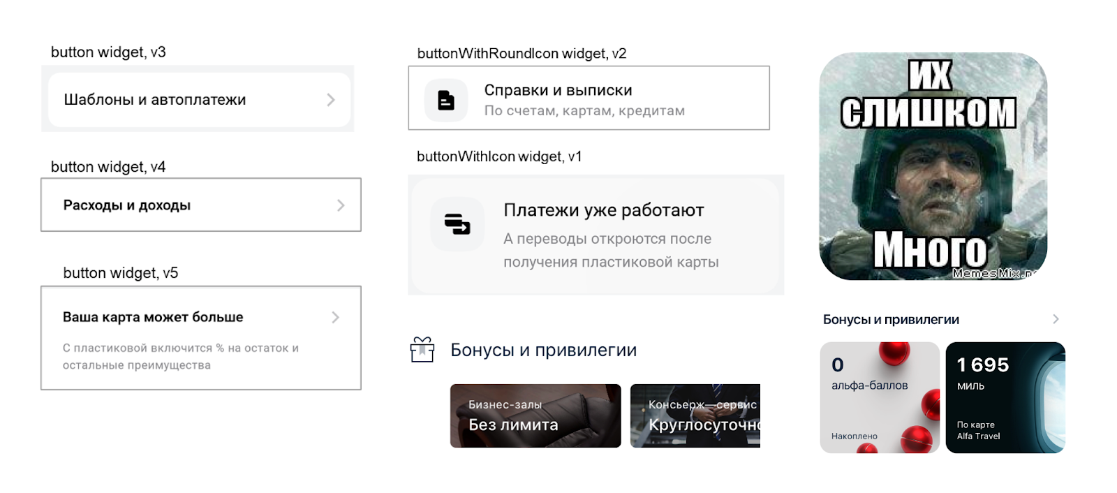 На картинке ниже несколько различных виджетов, в которые заложена одна и та же логика (получить текстовку и обработать нажатие), но при этом незначительно отличается UI. Хотя, казалось бы, должен быть один, ведь у нас есть текст, действие, иногда картинка. Но в сухом остатке это один и тот же виджет кнопки. Или, например, используются разные комбинации наших врапперов, из-за чего мы также получаем кучу «почти» одинаковых виджетов.