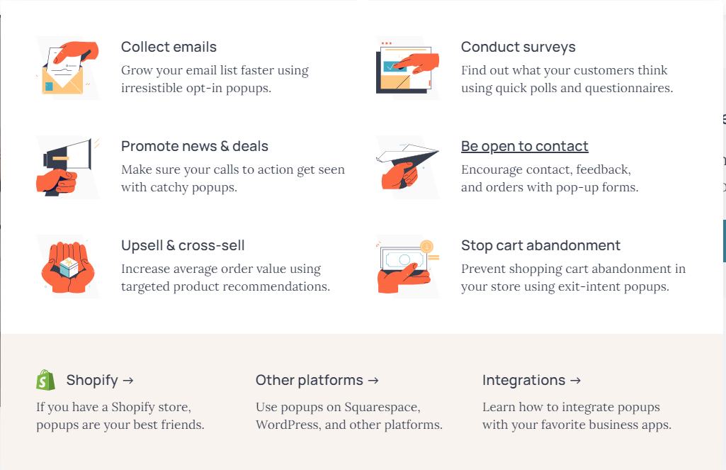 Всплывающие окна могут использоваться для уведомления посетителей об изменениях сайта, специальных предложениях или любых других соответствующих материалах, которые поощряют активное взаимодействие с вашим сайтом. Их можно использовать для предотвращения отказа от корзины, повышения конверсии и продвижения определенного содержания сайта.
