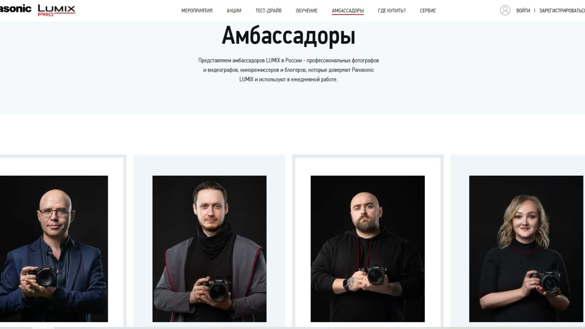 У брендов-производителей фотокамер практически всегда есть целая группа амбассадоров. Например, на сайте «Панасоник» они представлены отдельным списком – это профессиональный фотографы, которые пользуются камерой «Люмикс» каждый день