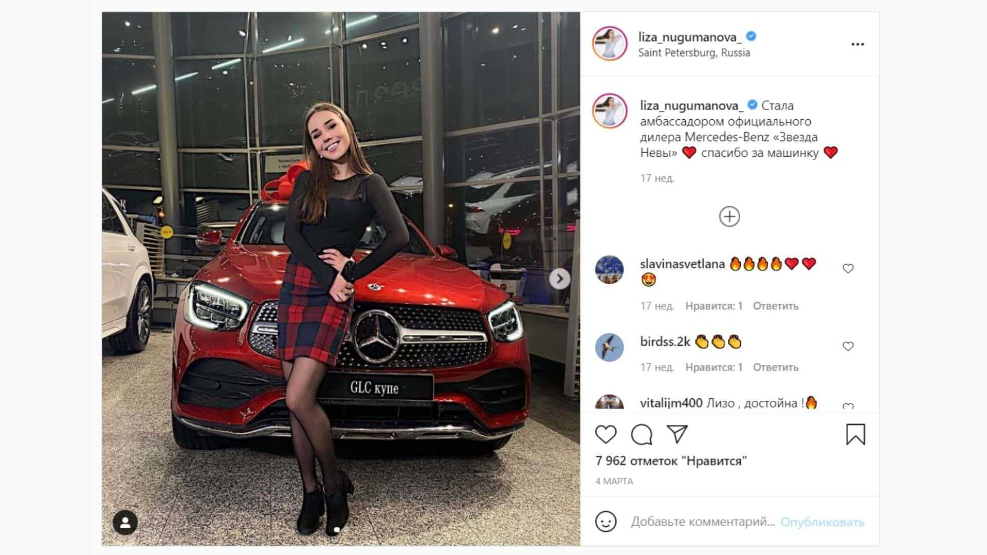 Фигуристка Елизавета Нугуманова стала амбассадором «Мерседес-Бенц» по бартеру – дилер подарил ей новый GLC Coupe Sport