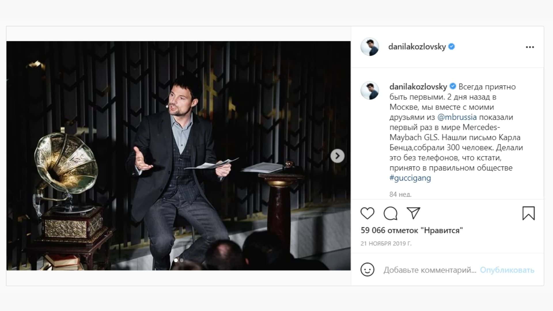 Актер Данила Козловский – посол бренда одежды «Гуччи» в России. Представили его на рождественской вечеринке бренда в 2016 году