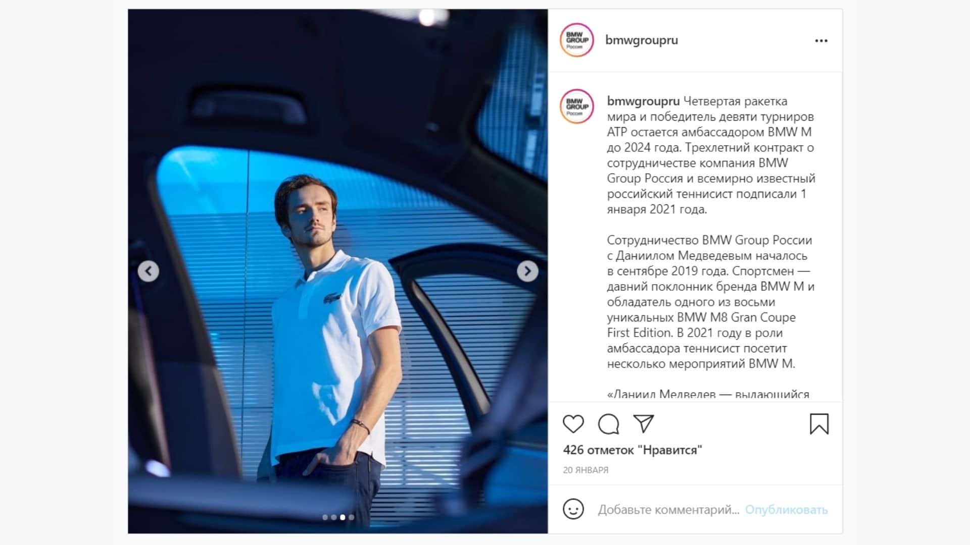 Спортсмен Данил Медведев стал амбассадором «БМВ» до 2024 года. Он сотрудничает с автомобильной компанией с 2019 года.