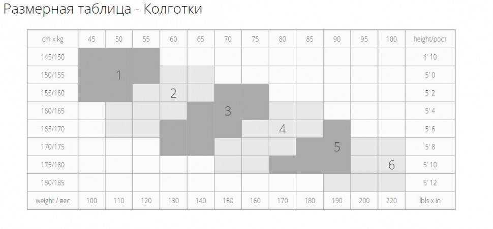Разновидности изделий бельевой группы, к которым относятся чулки и колготки женские, могут по-разному маркироваться. Обозначение размеров зависит от производителя. Общие параметры, принятые для размерного ряда, в таблице: