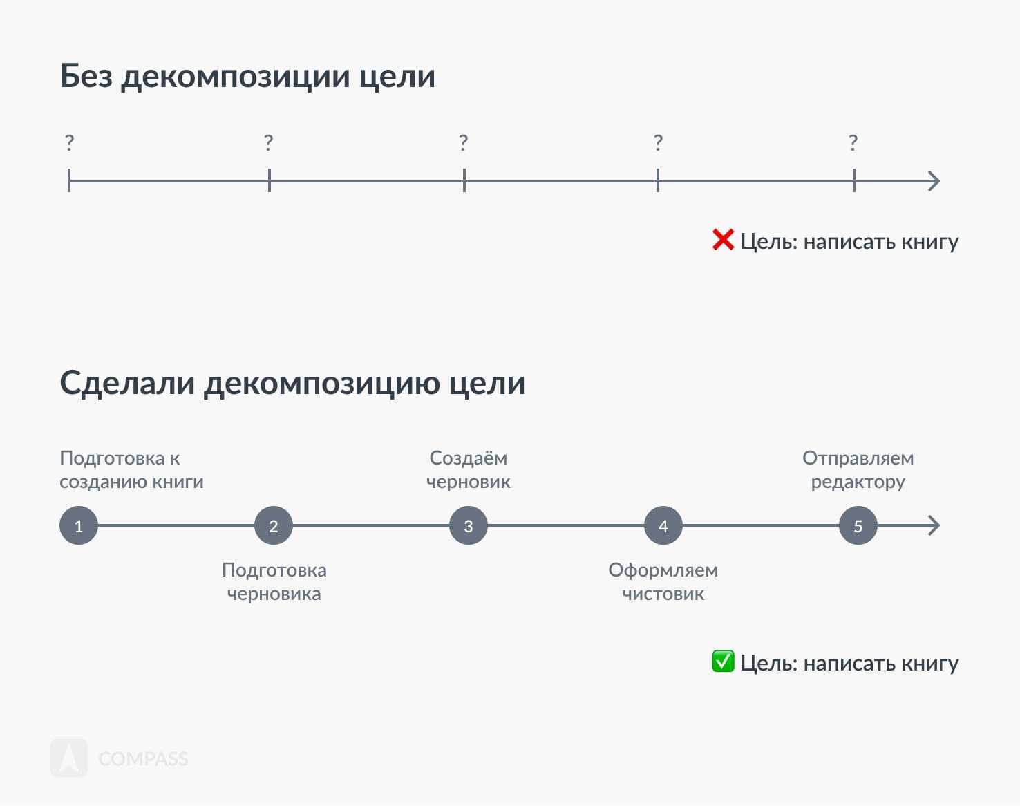 Декомпозиция конечной цели — это не план и не алгоритм. Она не определяет число шагов и их последовательность. Оно просто делит сложное на части, упрощая ее. Главное, вовремя остановится. Задачу надо делить до тех пор, пока она перестанет быть сложной.