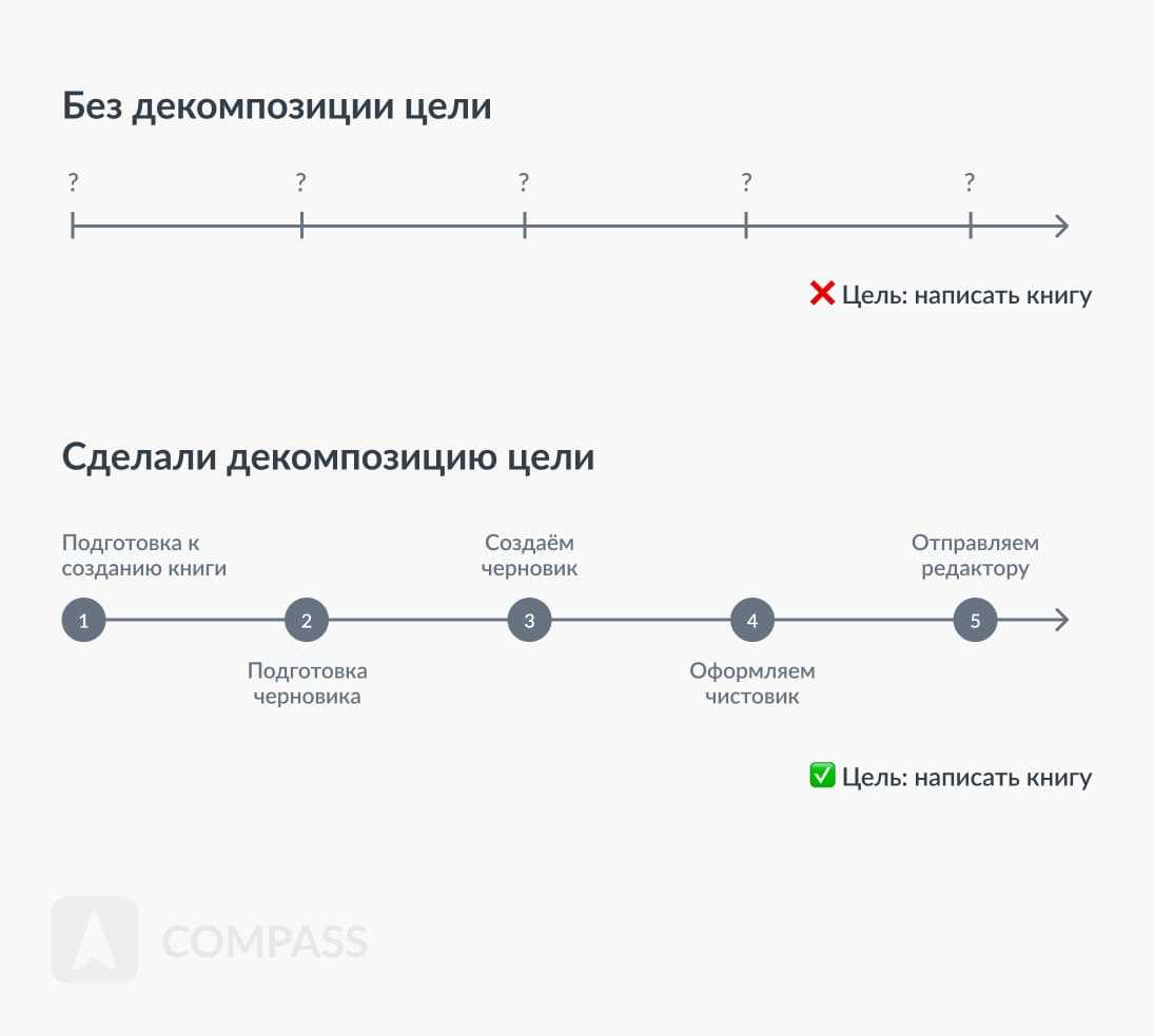 Понимание задач. Декомпозируя общую цель на более мелкие задачи, вы понимаете, что именно нужно сделать для ее достижения. Декомпозиция вносит в работу конкретику, детализирует этапы работы, позволяет оценить их с точки зрения затрат и получаемого результата.
